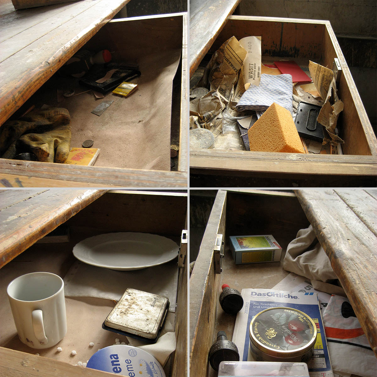 Ehemalige Gipsformerei der Porzellanfabrik Mitterteich, Schubladen an den Werkbänken mit persönlichen Gegenständen der Porzelliner, 2009